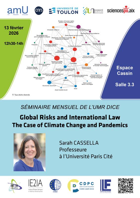 L'UMR DICE est heureuse de convier Sarah Cassella, Professeure à l'Université Paris Cité, pour un séminaire sur le thème : Global Risks and International Law. The Case of Climate Change and Pandemics