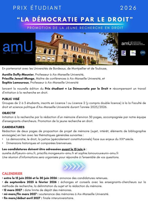 Par Charlotte LARGERON, 9 avril, 2026 Lundi 15 juin 2026 - 10:00 Jeudi 1 avril 2027 - 00:00 Retrouvez toutes les modalités sur le document : Document Prix jeune recherche en droit-2026 en ligne.pdf (781.27 Ko) ILF-GERJC