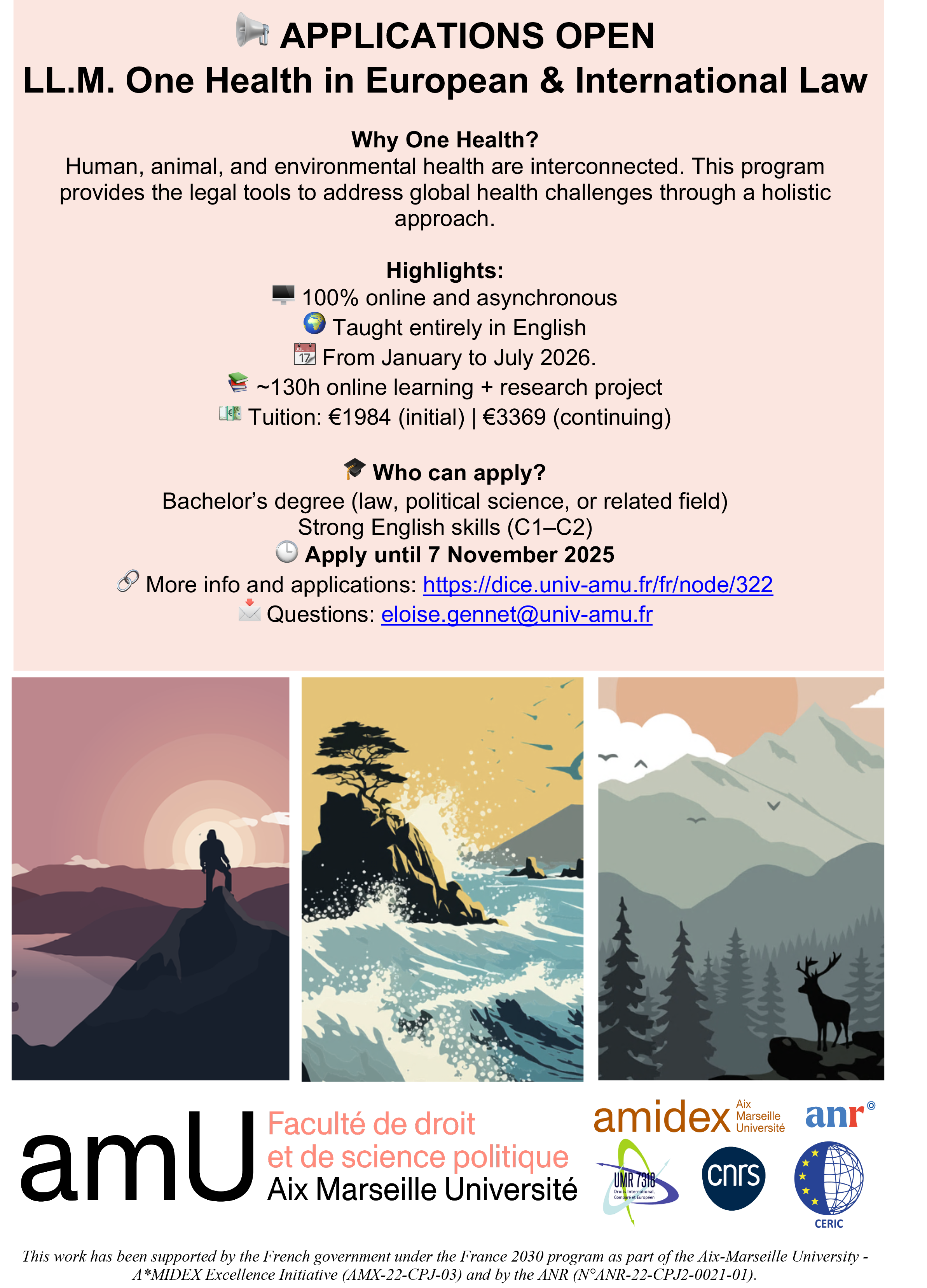 The Faculty of Law and Political Science of Aix-Marseille University is thrilled to announce the launch, in January 2026, of a new LLM program on the One Health approach in European and International Law, at the interface between human health, animal health, and the environment.